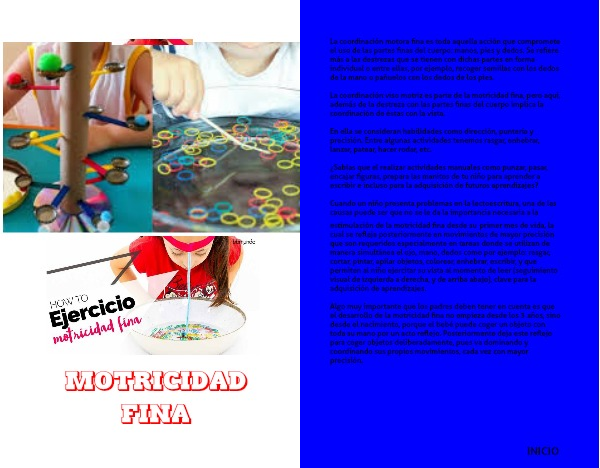 Cuando un niño presenta problemas en la lectoescritura, una de las causas puede ser que no se le da la importancia necesaria a la estimulación de la motricidad fina desde su primer mes de vida, la cual se refleja posteriormente en movimientos de mayor precisión que son requeridos especialmente en tareas donde se utilizan de manera simultánea el ojo, mano, dedos como por ejemplo: rasgar, cortar, pintar, apilar objetos, colorear, enhebrar, escribir, y que permiten al niño ejercitar su vista al momento de leer (seguimiento visual de izquierda a derecha, y de arriba abajo), clave para la adquisición de aprendizajes.