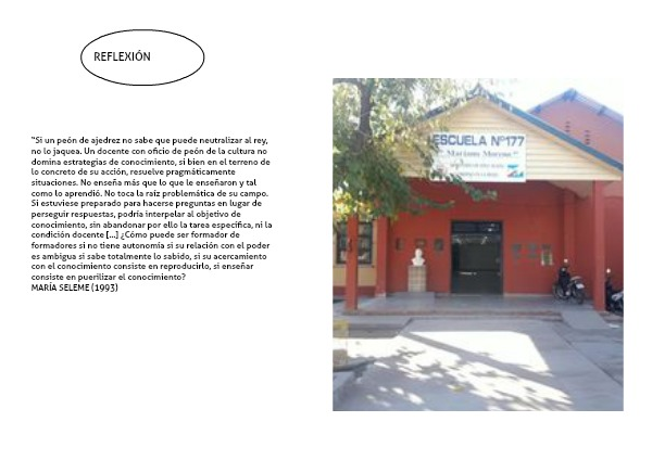 “Si un peón de ajedrez no sabe que puede neutralizar al rey, no lo jaquea. Un docente con oficio de peón de la cultura no domina estrategias de conocimiento, si bien en el terreno de lo concreto de su acción, resuelve pragmáticamente situaciones. No enseña más que lo que le enseñaron y tal como lo aprendió. No toca la raíz problemática de su campo. Si estuviese preparado para hacerse preguntas en lugar de perseguir respuestas, podría interpelar al objetivo de conocimiento, sin abandonar por ello la tarea específica, ni la condición docente […] ¿Cómo puede ser formador de formadores si no tiene autonomía si su relación con el poder es ambigua si sabe totalmente lo sabido, si su acercamiento con el conocimiento consiste en reproducirlo, si enseñar consiste en puerilizar el conocimiento?