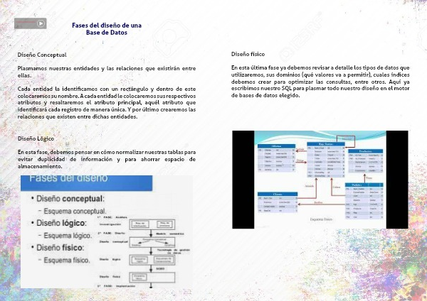 En esta última fase ya debemos revisar a detalle los tipos de datos que utilizaremos, sus dominios (qué valores va a permitir), cuales índices debemos crear para optimizar las consultas, entre otros. Aquí ya escribimos nuestro SQL para plasmar todo nuestro diseño en el motor de bases de datos elegido.