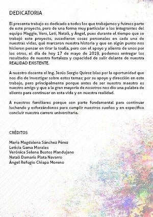 El presenta trabajo es dedicado a todos los que trabajamos y fuimos parte de este proyecto, pero de una forma muy particular a los integrantes del equipo Maggie, Vero, Leti, Natali, y Ángel, pues durante el tiempo que se trabajó este proyecto, sucedieron cosas personales en cada una de nuestras vidas, qué marcaron nuestra historia y que en algún punto nos hicieron pensar en tirar la toalla, pero con el apoyo y aliento de unos por los otros, el día de hoy 17 de mayo de 2019, podemos entregar los resultados de nuestra fortaleza y capacidad de salir delante de nuestra REALIDAD EXISTENTE.