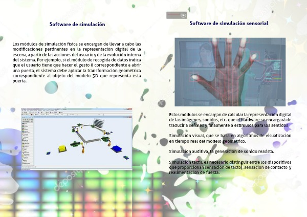 Los módulos de simulación física se encargan de llevar a cabo las modificaciones pertinentes en la representación digital de la escena, a partir de las acciones del usuario y de la evolución interna del sistema. Por ejemplo, si el módulo de recogida de datos indica que el usuario tiene que hacer el gesto 8 correspondiente a abrir una puerta, el sistema debe aplicar la transformación geométrica correspondiente al objeto del modelo 3D que representa esta puerta.