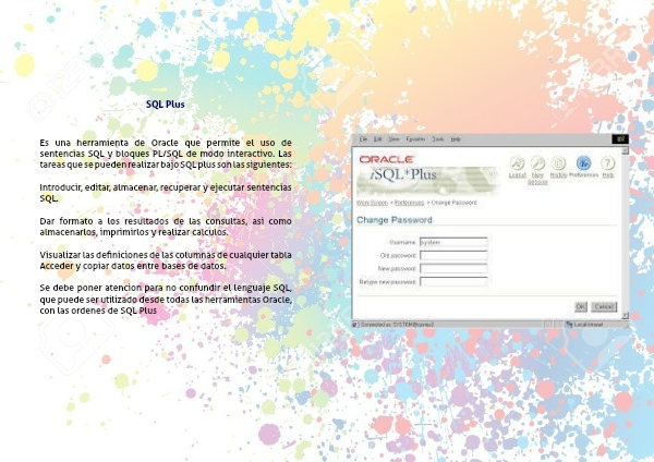 Es una herramienta de Oracle que permite el uso de sentencias SQL y bloques PL/SQL de modo interactivo. Las tareas que se pueden realizar bajo SQL plus son las siguientes: