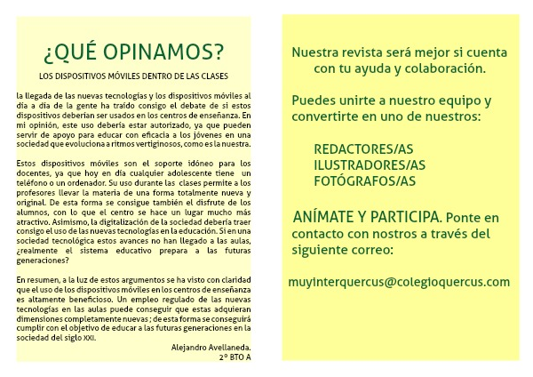 la llegada de las nuevas tecnologías y los dispositivos móviles al día a día de la gente ha traído consigo el debate de si estos dispositivos deberían ser usados en los centros de enseñanza. En mi opinión, este uso debería estar autorizado, ya que pueden servir de apoyo para educar con eficacia a los jóvenes en una sociedad que evoluciona a ritmos vertiginosos, como es la nuestra.