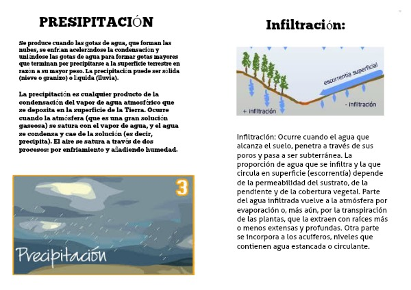 Infiltración: Ocurre cuando el agua que alcanza el suelo, penetra a través de sus poros y pasa a ser subterránea. La proporción de agua que se infiltra y la que circula en superficie (escorrentía) depende de la permeabilidad del sustrato, de la pendiente y de la cobertura vegetal. Parte del agua infiltrada vuelve a la atmósfera por evaporación o, más aún, por la transpiración de las plantas, que la extraen con raíces más o menos extensas y profundas. Otra parte se incorpora a los acuíferos, niveles que contienen agua estancada o circulante.