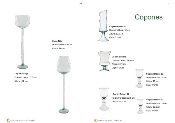 22 Copa Stile Diámetro boca: 13 cm Altura: 66 cm Copa Prestige Diámetro boca: 17,5 cm Altura: 61 cm Cristalería de Occidente Tel: 267 57 93