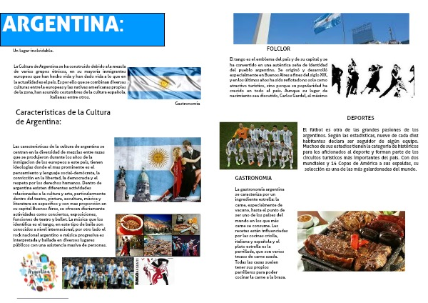 Las características de la cultura de argentina se centran en la diversidad de mezclas entre razas que se produjeron durante los años de la inmigacion de los europeos a este país, tienen ideologías donde el mas prominente es el pensamiento y lenguaje social-demócrata, la convicción en la libertad, la democracia y el respeto por los derechos humanos. Dentro de argentina existen diferentes actividades relacionadas a la cultura y arte, particularmente dentro del teatro, pintura, escultura, música y literatura en especifico y con mas proporción en su capital Buenos Aires, se ofrecen diariamente actividades como conciertos, exposiciones, funciones de teatro y ballet. La música que los identifica es el tango, en este tipo de baile son conocidos a nivel internacional, por otro lado el rock nacional argentino o música progresiva es interpretada y bailada en diversos lugares públicos con una asistencia masiva de personas.