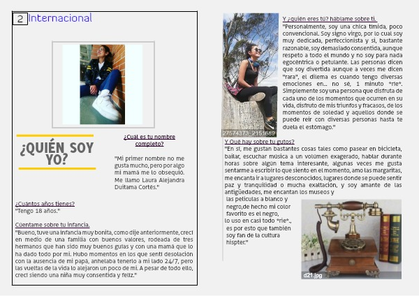 "Personalmente, soy una chica tímida, poco convencional. Soy signo virgo, por lo cual soy muy dedicada, perfeccionista y si, bastante razonable, soy demasiado consentida, aunque respeto a todo el mundo y no soy para nada egocéntrica o petulante. Las personas dicen que soy divertida aunque a veces me dicen "rara", el dilema es cuando tengo diversas emociones en... no sé, 1 minuto *ríe*. Simplemente soy una persona que disfruta de cada uno de los momentos que ocurren en su vida, disfruto de mis triunfos y fracasos, de los momentos de soledad y aquellos donde se puede reir con diversas personas hasta te duela el estómago."