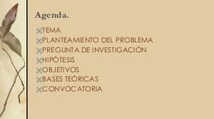 Agenda. TEMA PLANTEAMIENTO DEL PROBLEMA PREGUNTA DE INVESTIGACIÓN HIPÓTESIS OBJETIVOS BASES TEÓRICAS CONVOCATORIA