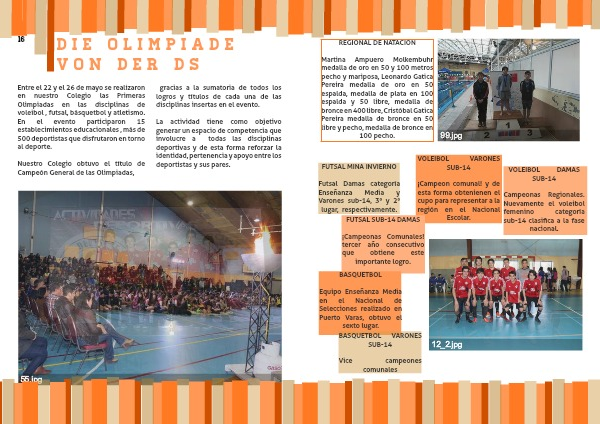 Entre el 22 y el 26 de mayo se realizaron en nuestro Colegio las Primeras Olimpiadas en las disciplinas de voleibol , futsal, básquetbol y atletismo. En el evento participaron 15 establecimientos educacionales , más de 500 deportistas que disfrutaron en torno al deporte.