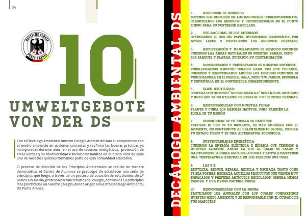 Con el Decálogo Ambiental nuestro Colegio Alemán declara su compromiso con el medio ambiente en acciones concretas y reafirma las buenas prácticas ya incorporadas durante años, en el uso de recursos energéticos, protección de áreas verdes y su biodiversidad e incorporar hábitos en el diario vivir de cada uno de nosotros quienes formamos parte de esta comunidad educativa.