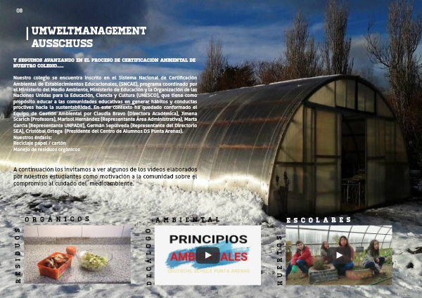 Nuestro colegio se encuentra inscrito en el Sistema Nacional de Certificación Ambiental de Establecimientos Educacionales, (SNCAE), programa coordinado por el Ministerio del Medio Ambiente, Ministerio de Educación y la Organización de las Naciones Unidas para la Educación, Ciencia y Cultura (UNESCO), que tiene como propósito educar a las comunidades educativas en generar hábitos y conductas proclives hacia la sustentabilidad. En este contexto ha quedado conformado el Equipo de Gestión Ambiental por Claudia Bravo (Directora Académica), Jimena Scarich (Profesora), Marisol Hernández (Representante Área Administrativa), Marta García (Representante UNPADE), Germán Sepúlveda (Representante del Directorio SEA), Cristóbal Ortega (Presidente del Centro de Alumnos DS Punta Arenas).