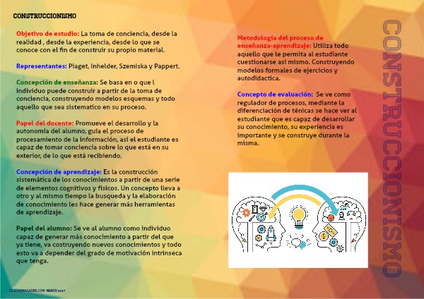 Papel del alumno: Se ve al alumno como individuo capaz de generar más conocimiento a partir del que ya tiene, va costruyendo nuevos conocimientos y todo esto va a depender del grado de motivación intrinseca que tenga.