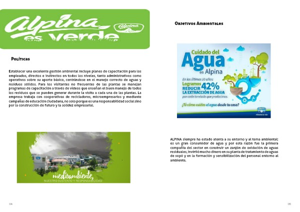 ALPINA siempre ha estado atenta a su entorno y al tema ambiental: es un gran consumidor de agua y por esta razón fue la primera compañía del sector en construir un zanjón de oxidación de aguas residuales, invirtió mucho dinero en su planta de tratamiento de aguas de sopó y en la formación y sensibilización del personal entorno al ambiente.