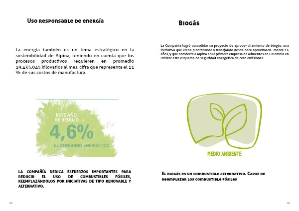 La Compañía logró consolidar su proyecto de aprove- chamiento de biogás, una iniciativa que viene planificando y trabajando desde hace aproximada- mente 16 años, y que convierte a Alpina en la primera empresa de alimentos en Colombia en utilizar este esquema de seguridad energética de cero emisiones.