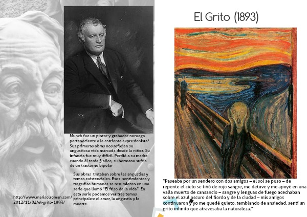 Munch fue un pintor y grabador noruego perteneciente a la corriente expresionista*. Sus primeras obras nos reflejan su angustiosa vida marcada desde la niñez. Su infancia fue muy difícil. Perdió a su madre cuando él tenia 5 años, su hermana sufría de un trastorno bipolar