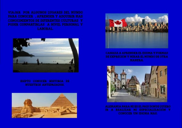 VIAJAR POR ALGUNOS LUGARES DEL MUNDO PARA CONOCER , APRENDER Y ADQUIRIR MAS CONOCIMIENTOS DE DIFERENTES CULTURAS Y PODER COMPARTIRLAS A NIVEL PERSONAL Y LABORAL.