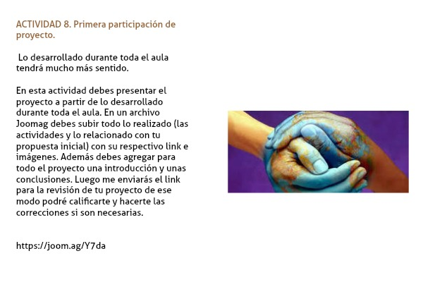En esta actividad debes presentar el proyecto a partir de lo desarrollado durante toda el aula. En un archivo Joomag debes subir todo lo realizado (las actividades y lo relacionado con tu propuesta inicial) con su respectivo link e imágenes. Además debes agregar para todo el proyecto una introducción y unas conclusiones. Luego me enviarás el link para la revisión de tu proyecto de ese modo podré calificarte y hacerte las correcciones si son necesarias.