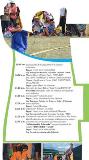 10:00 a. m Misa en Honor al Santo Patrón“ SAN JUAN BAUTISTA“ oficiado por el Párroco José Luis Morales Yovera. ofrecida por la Priosta JULIA FARFAN VDA. DE ALARCÓN Lugar! Iglesia Matriz de. Mazamari