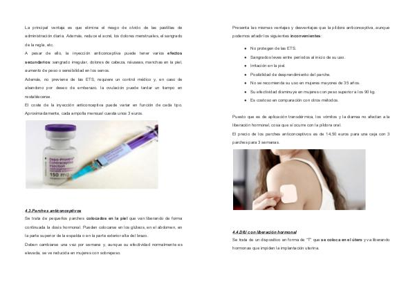 Presenta las mismas ventajas y desventajas que la píldora anticonceptiva, aunque