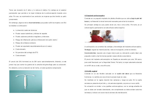 4.5. Implante anticonceptivo Consiste en un pequeño implante de plástico flexible que se coloca bajo la piel del brazo y va liberando la dosis hormonal necesaria para evitar la ovulación. Su principal ventaja es que puede durar uno, tres o cinco años. Por tanto, es un anticonceptivo permanente con alta eficacia anticonceptiva. A continuación, se comentan las ventajas y desventajas del implante anticonceptivo: Ventajas: regula las menstruaciones, reduce el sangrado y evita los dolores. Inconvenientes: requiere una cirugía menor para su colocación, puede dejar una pequeña cicatriz y las hormonas pueden causar efectos secundarios. El precio del implante anticonceptivo en España se encuentra por unos 150 euros, pero está financiado por la Seguridad Social. Por tanto, la mujer solamente abonará en el 40 % de su coste, unos 60 euros.