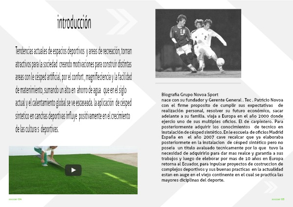 nace con su fundador y Gerente General . Tec . Patricio Novoa con el firme proposito de cumplir sus expectativas de realización personal, resolver su futuro económico, sacar adelante a su familia. viaja a Europa en el año 2000 donde ejercio uno de sus multiples oficios. El de carpintero. Para posteriormente adquirir los conocimientos de tecnico en instalación de césped sintético. En le escuela de oficios Madrid España en el año 2007 cave recalcar que ya elaboraba posteriormete en la instalacion de césped sintético pero no poseia un titulo avaluado tecnicamente por lo que tuvo la necesidad de adquirirlo para dar mas realce y garantia a sus trabajos y luego de eleborar por mas de 10 años en Europa retorna al Ecuador, para inpulsar proyectos de costruccion de complejos deportivos y sus buenas practicas en la actualidad estan en auge en el viejo continente en el cual se practica las mayores diciplinas del deporte.