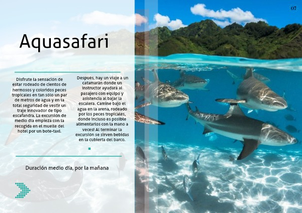 Después, hay un viaje a un catamarán donde un instructor ayudará al pasajero con equipo y asistencia al bajar la escalera. Camine bajo el agua en la arena, rodeado por los peces tropicales, donde incluso es posible alimentarlos con la mano a veces! Al terminar la excursión se sirven bebidas en la cubierta del barco.