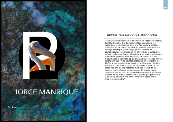 Jorge Manrique nació en el año 1440 en Paredes de Nava, Castilla, España. Era de nacionalidad castellana y el castellano era su lengua materna, fue poeta y soldado, falleció el 27 de marzo de 1479 en España. Su padre era Rodrigo Manrique y fue cónyuge de Guiomar de Castañeda, tuvo dos hijos de nombres Luis y Luisa. Era sobrino del poeta Gómez Manrique y su madre se llamaba Mencía de Figueroa. Fue partidario de combatir a los musulmanes y participo en el levantamiento de los nobles contra Enrique IV de Castilla, intervino en la victoria de Ajofrín y también jugó un papel en las intrigas y luchas entorno a la subida al trono de los Reyes Católicos. Su padre fue uno de los hombres más poderosos de su época y murió victima de un cáncer. Su madre murió cuando él era un niño. Estudio Humanidades y las tareas propias de un militar castellano. Su principal género era la poesía y escribió una obra llamada “Coplas por la muerte de su padre”.