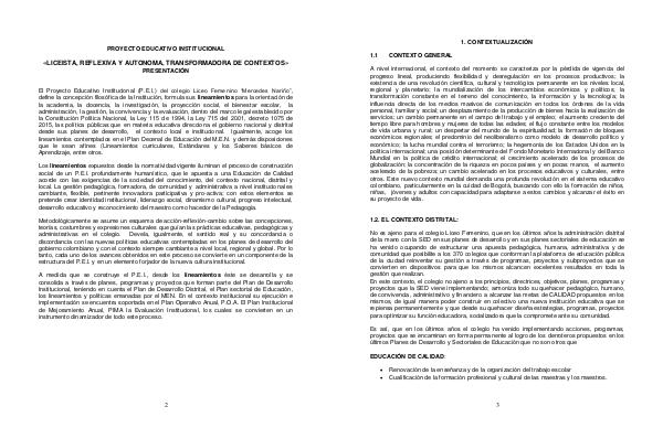 El Proyecto Educativo Institucional( P. E. I.) del colegio Liceo Femenino“ Mercedes Nariño”, define la concepción filosófica de la Institución, formula sus lineamientos para la orientación de la academia, la docencia, la investigación, la proyección social, el bienestar escolar, la administración, la gestión, la convivencia y la evaluación, dentro del marco legal establecido por la Constitución Política Nacional, la Ley 115 de 1994, la Ley 715 del 2001, decreto 1075 de 2015, las política públicas que en materia educativa direcciona el gobierno nacional y distrital desde sus planes de desarrollo, el contexto local e institucional. Igualmente, acoge los lineamientos contemplados en el Plan Decenal de Educación del M. E. N. y demás disposiciones que le sean afines( Lineamientos curriculares, Estándares y los Saberes básicos de Aprendizaje, entre otros.