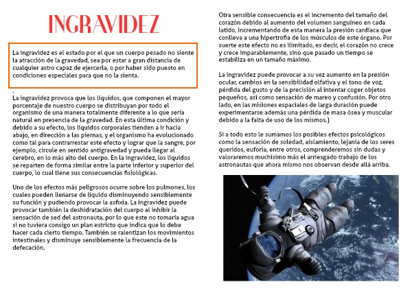 La ingravidez puede provocar a su vez aumento en la presión ocular, cambios en la sensibilidad olfativa y el tono de voz, pérdida del gusto y de la precisión al intentar coger objetos pequeños, así como sensación de mareo y confusión. Por otro lado, en las misiones espaciales de larga duración puede experimentarse además una pérdida de masa ósea y muscular debido a la falta de uso de los mismos.}