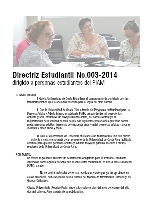 III. Que la Vicerrectoría de Docencia en Resolución Número tres uno tres nueve – ochenta y seis, como parte de un proyecto de la Universidad de Costa Rica facilita la apertura para que las personas adultas y adultas mayores puedan acceder a cursos regulares de la Universidad de Costa Rica.