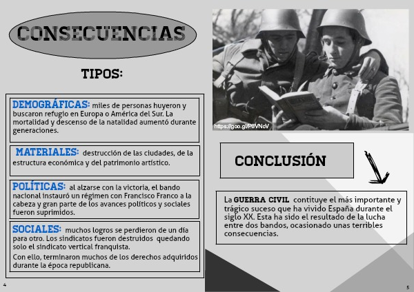 La Guerra Civil contituye el más importante y trágico suceso que ha vivido España durante el siglo XX. Esta ha sido el resultado de la lucha entre dos bandos, ocasionado unas terribles consecuencias.