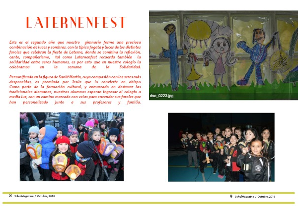 Este es el segundo año que nuestro gimnasio forma una preciosa combinación de luces y sombras, con la típica fogata y luces de los distintos faroles que celebran la fiesta de Laterne, donde se combina la reflexión, canto, compañerismo, tal como Laternenfest recuerda también la solidaridad entre seres humanos, es por esto que en nuestro colegio la celebramos en la semana de la Solidaridad.