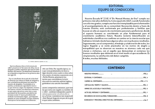 Nuestra Escuela N° 3 D.E. 8 "Dr. Manuel Montes de Oca" cumple sus primeros cien años de historia. Como aquel año 1917, cuando funcionaba con sólo tres grados, cumple una función irremplazable para la formación y el acompañamiento de su comunidad. Reconocida dentro y fuera de nuestro Distrito, está conformada por profesionales y familias que buscan en ella un espacio de crecimiento personal y profesional, donde el aspecto humano es considerado un pilar fundamental para el crecimiento académico futuro. Nuestra reciente intensificación en actividades científicas nos confirma un camino en la ciencia escolar que habíamos iniciado desde hace algunos años con muy buenos resultados. Seguramente, con el compormiso, el trabajo y colaboración de todos, los logros llegarán y se verán plasmados en los rostros de alegría y tranquilidad que se observan en nuestros ex alumnos cada vez que vienen a visitarnos, con el orgullo que demuestran al contarnos los buenos resultados que obtienen en el nivel medio al que accedieron. Es simplemente, la satisfacción del deber cumplido.