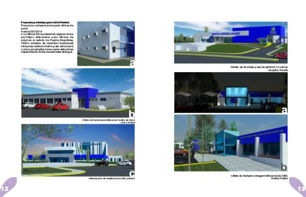 Proyectos prototipo para la SSA-Puebla Proyectos y anteproyectos para clínicas de salud Puebla 2013-2014 A continuación se presentan algunos de los prototipos elaborados para clínicas de salud en el estado de Puebla( Hospitales, CESSA, Módulos de medicina tradicional) estas propuestas son tanto para obra nueva como para ampliaciones y remodelaciones dependiendo de las necesidades del lugar.