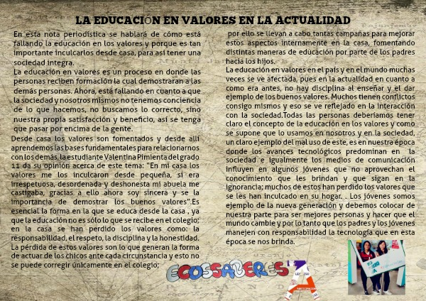 La educación en valores en el país y en el mundo muchas veces se ve afectada, pues en la actualidad en cuanto a como era antes, no hay disciplina al enseñar y el dar ejemplo de los buenos valores. Muchos tienen conflictos consigo mismos y eso se ve reflejado en la interacción con la sociedad.Todas las personas deberíamos tener claro el concepto de la educación en los valores y como se supone que lo usamos en nosotros y en la sociedad, un claro ejemplo del mal uso de este, es en nuestra época donde los avances tecnológicos predominan en la sociedad e igualmente los medios de comunicación influyen en algunos jóvenes que no aprovechan el conocimiento que les brindan y que sigan en la ignorancia; muchos de estos han perdido los valores que se les han inculcado en su hogar. . Los jóvenes somos ejemplo de la nueva generación y debemos colocar de nuestra parte para ser mejores personas y hacer que el mundo cambie y por lo tanto que los padres y los jóvenes manejen con responsabilidad la tecnología que en esta época se nos brinda.