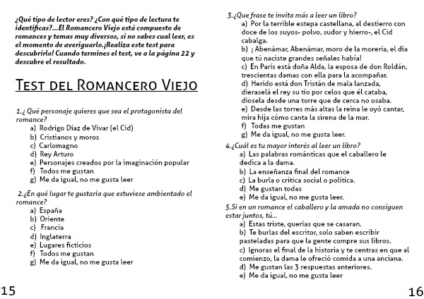 ¿Qué tipo de lector eres? ¿Con qué tipo de lectura te identificas?...El Romancero Viejo está compuesto de romances y temas muy diversos, si no sabes cual leer, es el momento de averiguarlo.¡Realiza este test para descubrirlo! Cuando termines el test, ve a la página 22 y descubre el resultado.