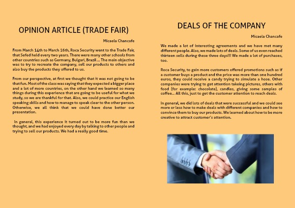 From March 14th to March 16th, Roca Security went to the Trade Fair, that Sefed held every two years. There were many other schools from other countries such as Germany, Bulgari, Brazil ... The main objective was to try to recreate the company, sell our products to others and also buy the products they offered to us.
