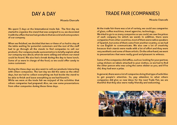 When we finished, we decided that two or three of us had to stay at the table waiting for potential customers and the rest of the staff had to go through all the stands to find companies to sell our products. Our company made a presentation to briefly explain what our company was about, what we were selling and where our stand could be found. We also had a break during the day to have lunch. Some of us were in charge of the food, so we could offer candy to some customers