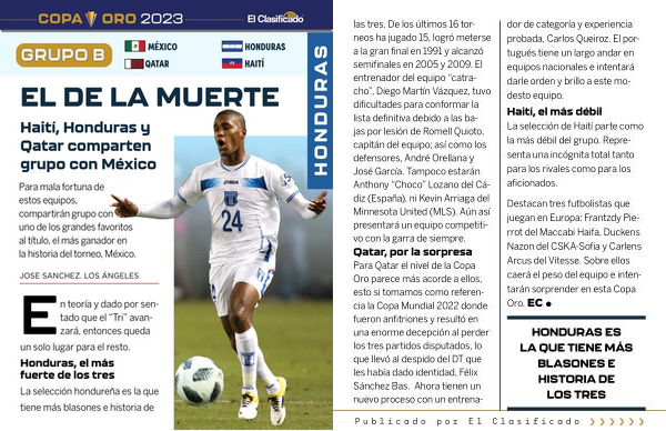 las tres . De los últimos 16 torneos ha jugado 15 , logró meterse a la gran final en 1991 y alcanzó semifinales en 2005 y 2009 . El entrenador del equipo “ catracho ”, Diego Martín Vázquez , tuvo dificultades para conformar la lista definitiva debido a las bajas por lesión de Romell Quioto , capitán del equipo ; así como los defensores , André Orellana y José García . Tampoco estarán Anthony “ Choco ” Lozano del Cádiz ( España ), ni Kevin Arriaga del Minnesota United ( MLS ). Aún así presentará un equipo competitivo con la garra de siempre . Qatar , por la sorpresa Para Qatar el nivel de la Copa Oro parece más acorde a ellos , esto si tomamos como referencia la Copa Mundial 2022 donde fueron anfitriones y resultó en una enorme decepción al perder los tres partidos disputados , lo que llevó al despido del DT que les había dado identidad , Félix Sánchez Bas . Ahora tienen un nuevo proceso con un entrenador de categoría y experiencia probada , Carlos Queiroz . El portugués tiene un largo andar en equipos nacionales e intentará darle orden y brillo a este modesto equipo . Haití , el más débil La selección de Haití parte como la más débil del grupo . Representa una incógnita total tanto para los rivales como para los aficionados .