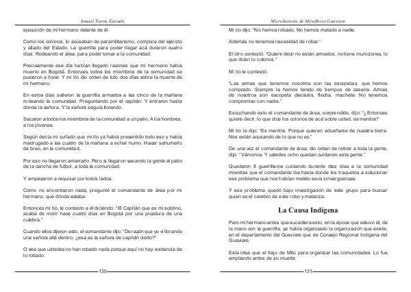 Precisamente ese día habían llegado razones que mi hermano había muerto en Bogotá. Entonces todos los miembros de la comunidad se pusieron a llorar. Y mi tío dio orden de luto dos días sobre la muerte de mi hermano.