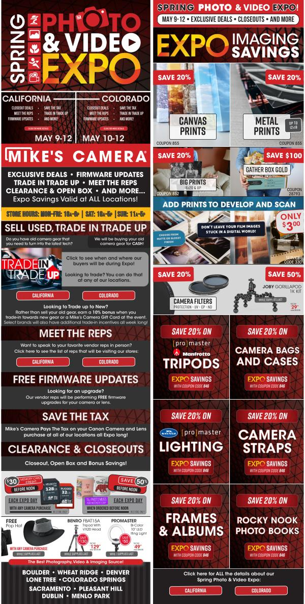 Click here for ALL the details about our Spring Photo & Video Expo : visit mikescamera . com for all the details ! california COLORADO