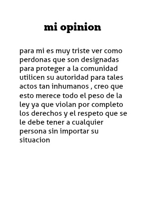 para mi es muy triste ver como perdonas que son designadas para proteger a la comunidad utilicen su autoridad para tales actos tan inhumanos , creo que esto merece todo el peso de la ley ya que violan por completo los derechos y el respeto que se le debe tener a cualquier persona sin importar su situacion