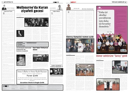 bir şekilde ekip olarak özel döner servisi sunacaklarını dile getirdi. Hume Helal Gıda Merkezi bir avantaj Saray Kebab olarak Yeşil Holding tarafından hizmete açılan Hume Helal Gıda Merkezi gibi bilinen bir adreste, bir çok farklı sektöründen üretim yapan gıda şirketi ile bir arada bulunmalarının kendileri için bir avantaj olduğunu dile getiren Saray Kebab yetkilileri, burada sektörler arasında bir dayanışma olduğunu hatırlatarak birbiri ile uyuşan ürünlerin pazarlamasını da birlikte yapacaklarını ifade etti. Saray Kebab olarak Avustralya’ nın her yerine servisleri olduğunu dile getiren şirket yetkilileri yakın zamanda smallgoods ü- rünlerinin de piyasaya sürüleceğini açıkladı.