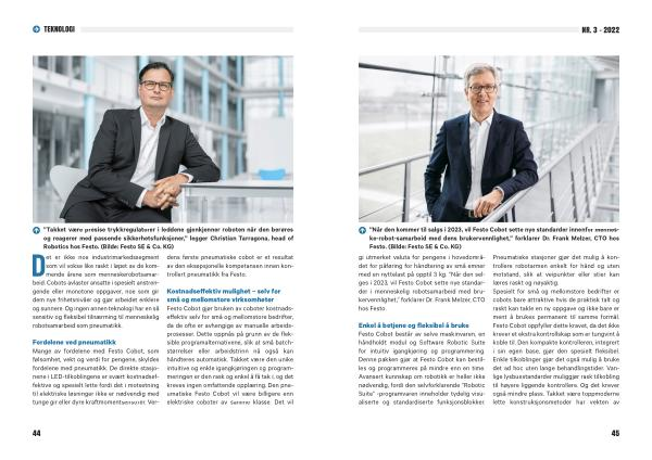 Det er ikke noe industrimarkedssegment som vil vokse like raskt i løpet av de kommende årene som menneskerobotsamarbeid . Cobots avlaster ansatte i spesielt anstrengende eller monotone oppgaver , noe som gir dem nye frihetsnivåer og gjør arbeidet enklere og sunnere . Og ingen annen teknologi har en så sensitiv og fleksibel tilnærming til menneskelig robotsamarbeid som pneumatikk .