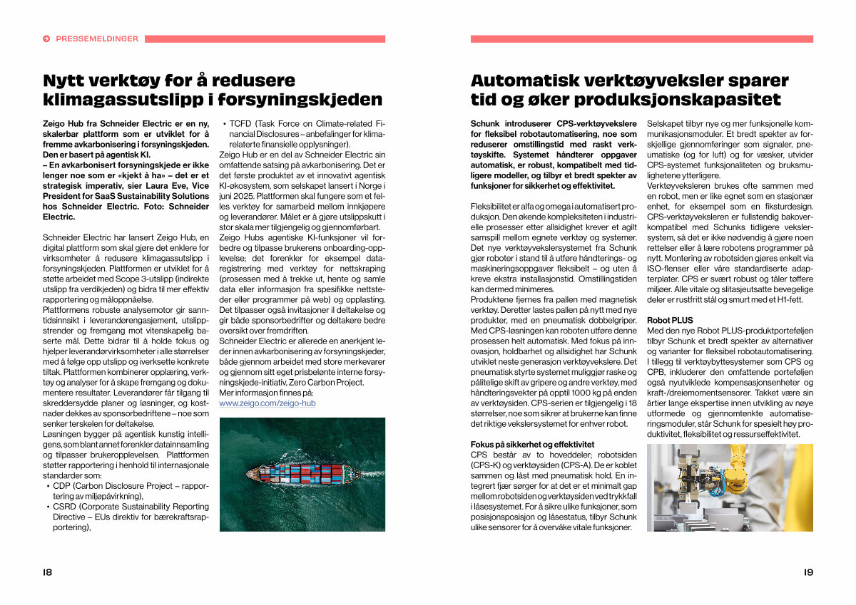 Schunk introduserer CPS-verktøyvekslere for fleksibel robotautomatisering, noe som reduserer omstillingstid med raskt verktøyskifte. Systemet håndterer oppgaver automatisk, er robust, kompatibelt med tidligere modeller, og tilbyr et bredt spekter av funksjoner for sikkerhet og effektivitet.