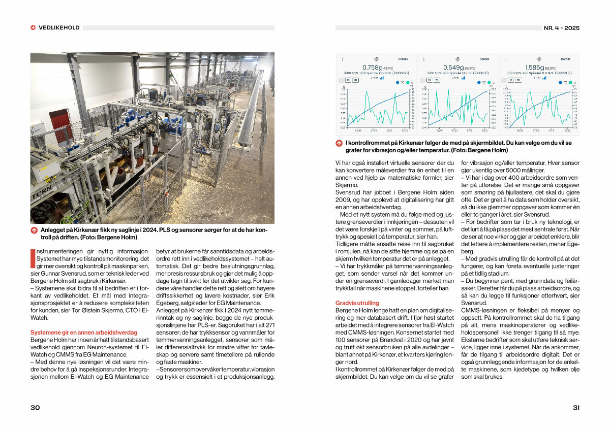 Systemene gir en annen arbeidshverdag Bergene Holm har i noen år hatt tilstandsbasert vedlikehold gjennom Neuron-systemet til El- Watch og CMMS fra EG Maintenance. – Med denne nye løsningen vil det være mindre behov for å gå inspeksjonsrunder. Integrasjonen mellom El-Watch og EG Maintenance betyr at brukerne får sanntidsdata og arbeidsordre rett inn i vedlikeholdssystemet – helt automatisk. Det gir bedre beslutningsgrunnlag, mer presis ressursbruk og gjør det mulig å oppdage tegn til svikt før det utvikler seg. For kundene våre handler dette rett og slett om høyere driftssikkerhet og lavere kostnader, sier Erik Egeberg, salgsleder for EG Maintenance. Anlegget på Kirkenær fikk i 2024 nytt tømmerinntak og ny saglinje, begge de nye produksjonslinjene har PLS-er. Sagbruket har i alt 271 sensorer; de har trykksensor og vannmåler for tømmervanningsanlegget, sensorer som måler differensialtrykk for mindre vifter for tavleskap og servere samt timetellere på rullende og faste maskiner. – Sensorer som overvåker temperatur, vibrasjon og trykk er essensielt i et produksjonsanlegg.