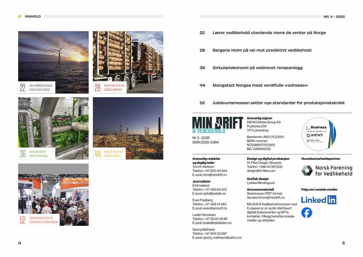 Min Drift & Vedlikehold kommer med 6 utgaver pr. år og blir distribuert digitalt til abonnenter og NFVs kontakter. I tillegg benyttes sosiale medier og nettsiden.