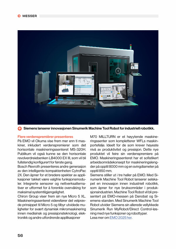 M70 MILLTURN er et høyytende maskineringssenter som kompletterer WFLs maskinportefølje. Ideelt for de som krever høyeste nivå av produktivitet og presisjon. Dette nye produktet vil feire sin verdenspremiere på EMO. Maskineringssenteret har et sofistikert arbeidsområdekonsept for maskineringslengder på opptil 8000 mm og en svingdiameter på opptil 850 mm. Siemens stiller ut i tre haller på EMO. Med Sinumerik Machine Tool Robot lanserer selskapet en innovasjon innen industriell robotikk, som åpner for nye bruksområder i produksjonsindustrien. Machine Tool Robot vil bli presentert på EMO-messen på Danobat og Siemens-standen. Med Sinumerik Machine Tool Robot utvider Siemens sin allerede vellykkede Sinumerik Run MyRobot / Direct Control-løsning med nye funksjoner og robottyper. Less mer om EMO 2025 her.
