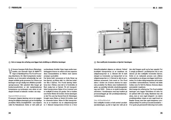 Egenutviklet prosess Prosessen i dagens løsning , som er en oppgradering fra tidligere løsninger , gir tre forskjellige produkter : fileter , brunkjøtt / fett - som skjæres vekk fra fiskeskinnet . Dette er helt unikt på verdensbasis , forteller Vigre . Ingen andre maskinbyggere leverer en enhet som kan separere disse bestanddelene av fileten med samme presisjon og kvalitet . Før første ledd i prosessen er hode , finner og ben fjernet , og fisken delt i to . Alle ben behøver ikke å fjernes . Trio Foods løsning håndteres ben i fileten , men det er å foretrekke at flest mulig ben er fjernet . På ett transportbånd transporteres fisken til en trommel som er nedkjølt til minus 20 grader . Det er kulden som fester fileten til tromlen . Denne løsningen er det Trio som har funnet frem til . Skinningen foregår mens fisken er festet til tromlen , med to roterende kniver . Skinn fri filet transporteres ut av maskinen via en utløpstransportør nr . 1 . Skinnet transporteres til kniv nr . 2 hvor