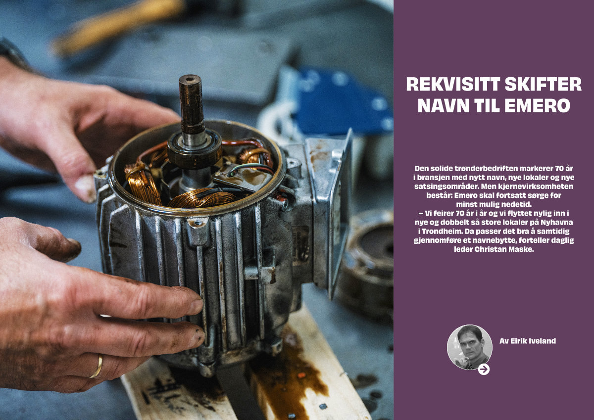 Den solide trønderbedriften markerer 70 år i bransjen med nytt navn, nye lokaler og nye satsingsområder. Men kjernevirksomheten består: Emero skal fortsatt sørge for minst mulig nedetid. – Vi feirer 70 år i år og vi flyttet nylig inn i nye og dobbelt så store lokaler på Nyhavna i Trondheim. Da passer det bra å samtidig gjennomføre et navnebytte, forteller daglig leder Christan Maske.